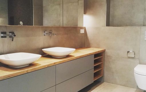 Dieses Gästebad wurde mit einer Naturholzplatte stilvoll veredelt.