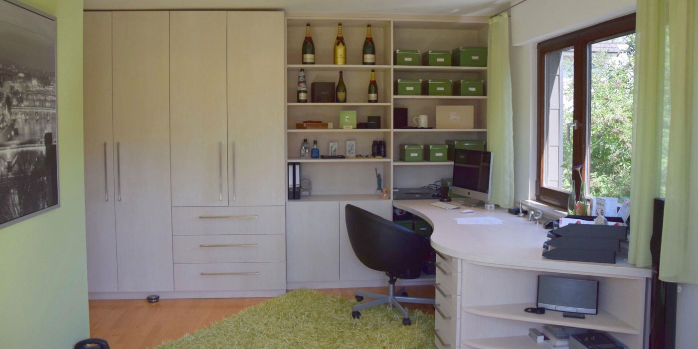 Durch die mit Esche furnierten ausgebürsteten weiß lackierten Schränke wird das Büro ein echter Hingucker – so macht die Büroarbeit doch richtig Spaß.