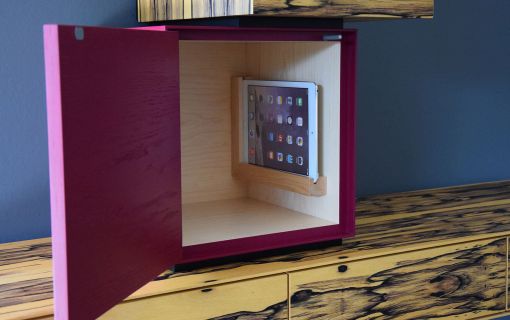 aus edlem Makassar-Furnier gefertigt, in Kombination mit bordeauxvioletten Würfeln und hochwertiger Innenausstattung.