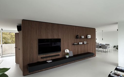 Ausbau eines Penthouses in Bietigheim-Bissingen Wandbekleidung in Walnussbaum mit TV-Board schwarz matt lackiert sowie einer indirekten LED-Beleuchtung.
